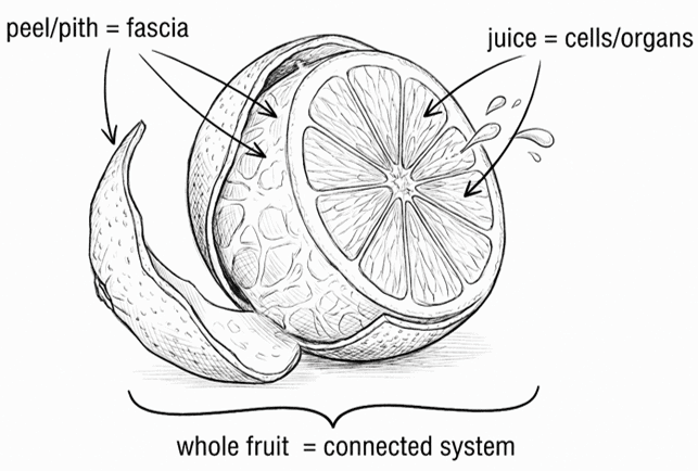 When you cut it, you see the peel. The white stringy stuff underneath. The thin walls between each section. That’s fascia. it surrounds the entire fruit, isn’t it?